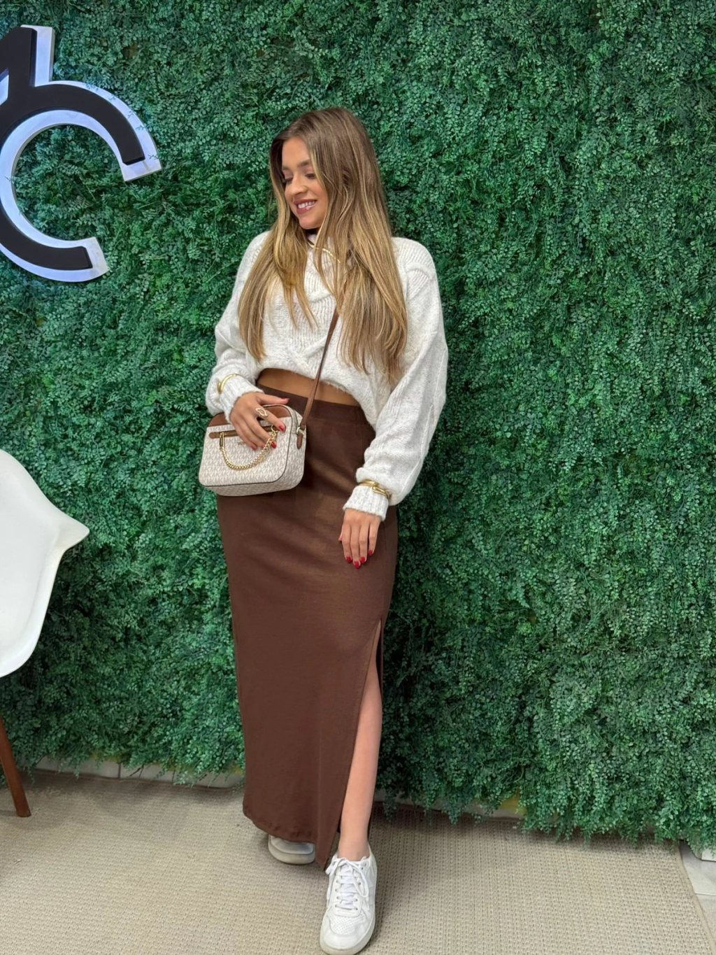 Confeccionada em malha canelada de alta elasticidade, ela valoriza o corpo com conforto e estilo. Possui elástico na cintura e uma fenda lateral que traz um toque de sensualidade e modernidade na medida certa.